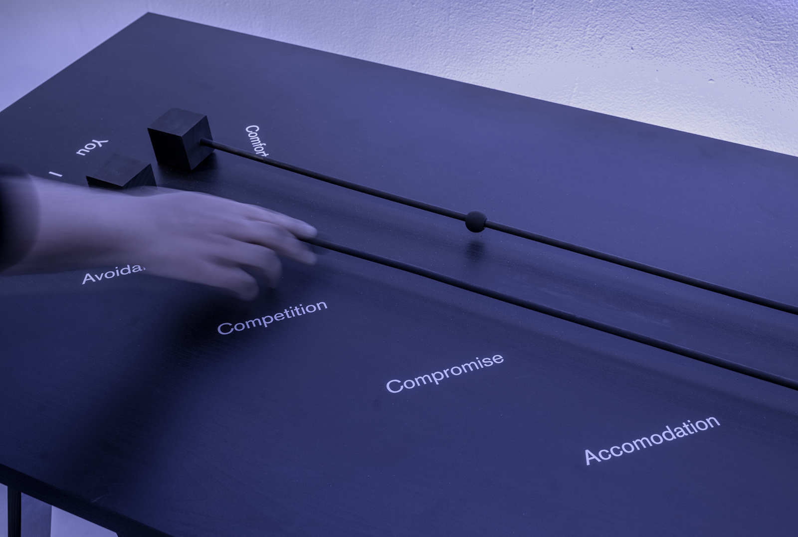 Image Description: Jeff Kasper, scaling vulnerability (2019). A blurry hand slides a bead along a minimal bar scale set on a black table. The location of the bead is hard to discern. Below numerous positions on the scale are words set in white: “Avoidance” “Competition” “Compromise” “Accomodation” and above, “Comfort”. At either end of the scale are the proxies “You” and “I”.