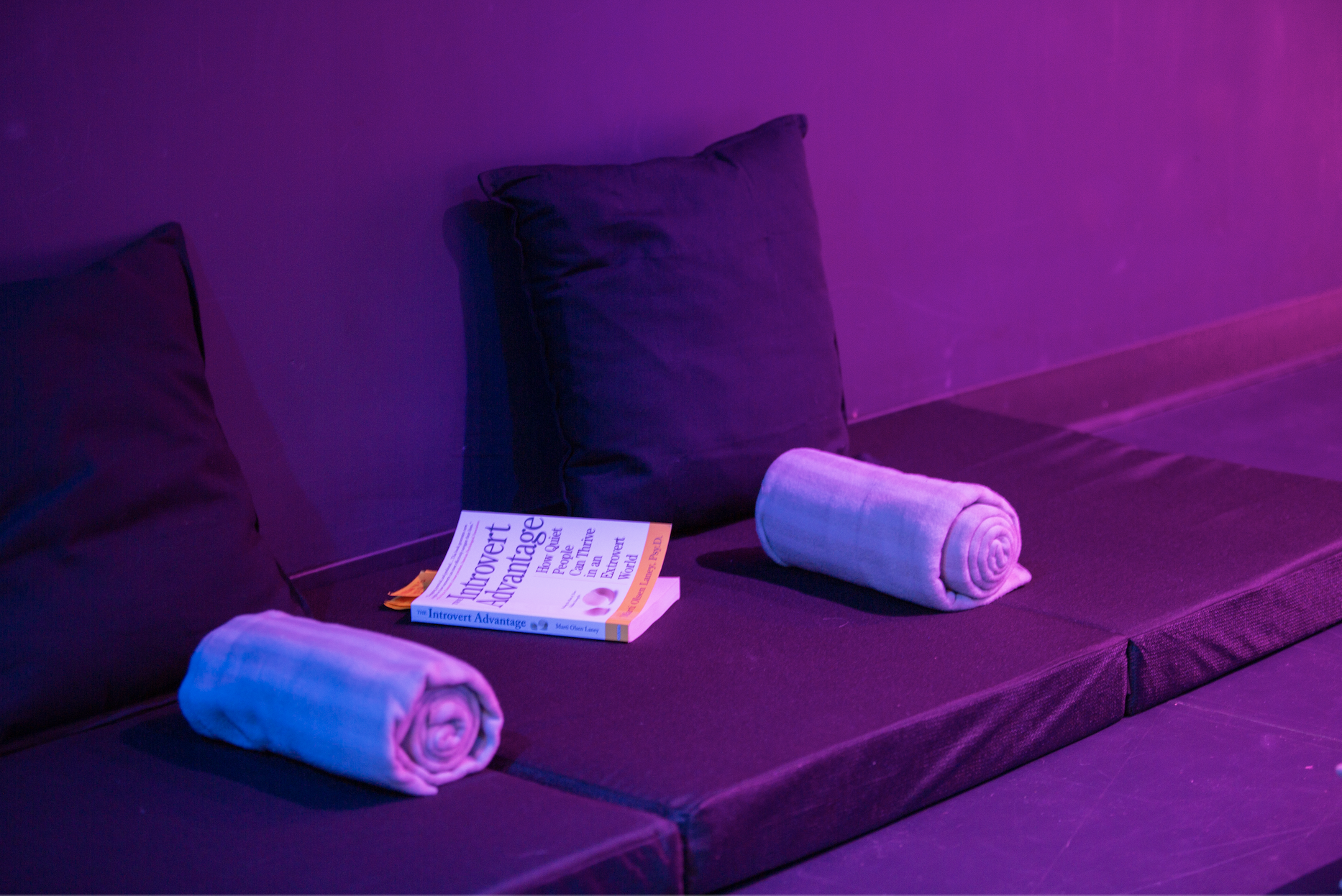 The low-light sensory space offers time to strategize safety and consent with others. Accompanying programs are co-designed with participants and guest organizers to offer context specific tools for exploring care, conflict, and accountability. Visitors are encouraged to bring a partner, friend, accomplice, or feel free to participate solo in the many lounges for play, napping, nervous system health, and reading.